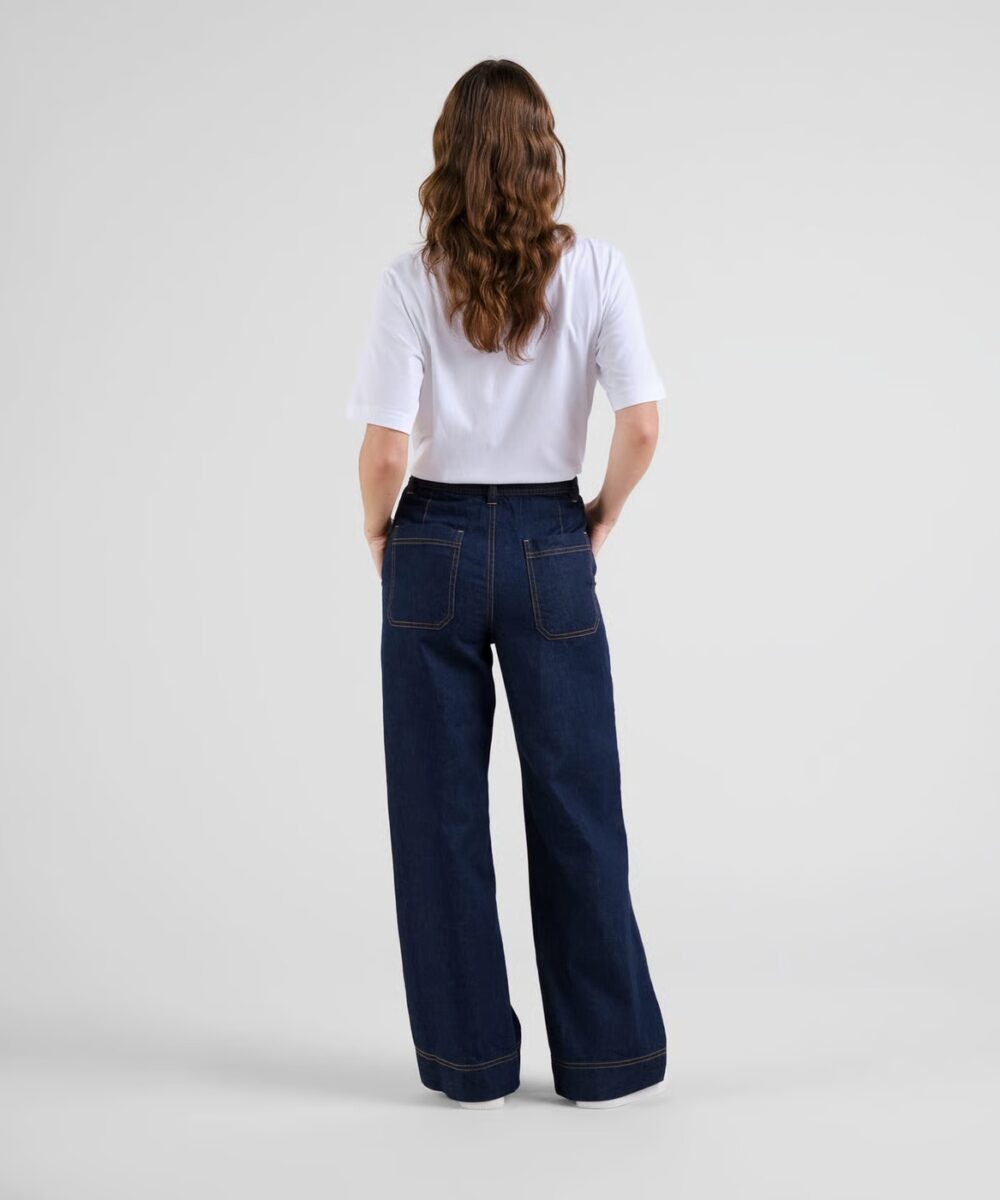 Onze populairste broek, de Vara, heeft een flatterende pasvorm die iedereen staat met een omhullende hoge taille die overgaat in een steeds wijder wordende pijp. De hoge taille accentueert de taille, terwijl de wijde, lange pijpen recht vanaf de heup naar beneden vallen voor een comfortabel, lang silhouet. Deze broek is geïnspireerd op werkkleding en uitgevoerd in donkerblauw denim met contrasterende stiksels, opgestikte zakken aan de voor- en achterkant en een elastische tailleband aan de achterkant voor extra comfort. Gemaakt van biologisch katoen gemengd met GRS-gecertificeerd gerecycled katoen om het gebruik van nieuwe vezels te verminderen. Combineer met een wit T-shirt en sneakers, of een gestreept overhemd en loafers.