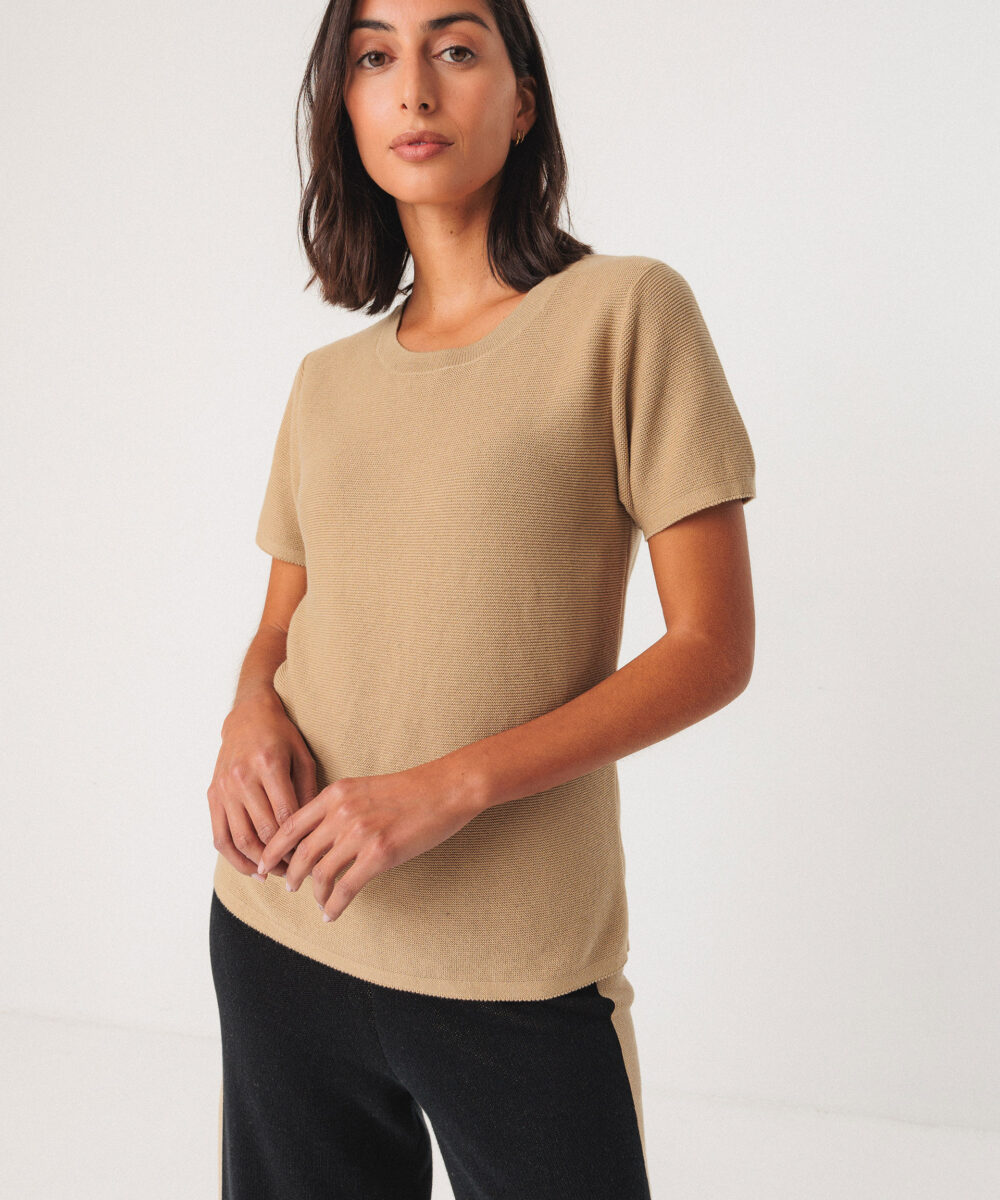 Lightweight top van gebreid biologisch katoen in de kleur beige. De top heeft een ronde hals en korte mouwen met een straight fit. Ideaal als basistop en net toch even anders, dankzij het mooie breimotief.