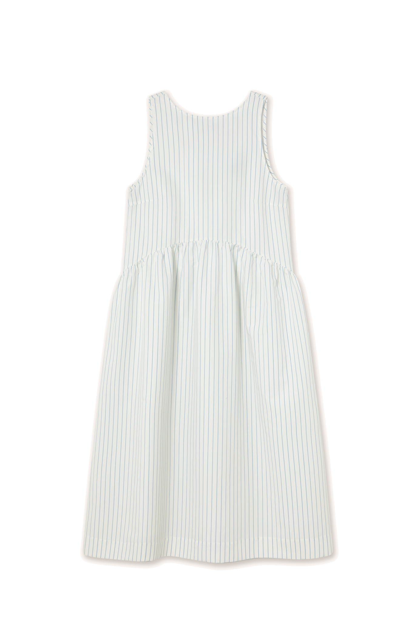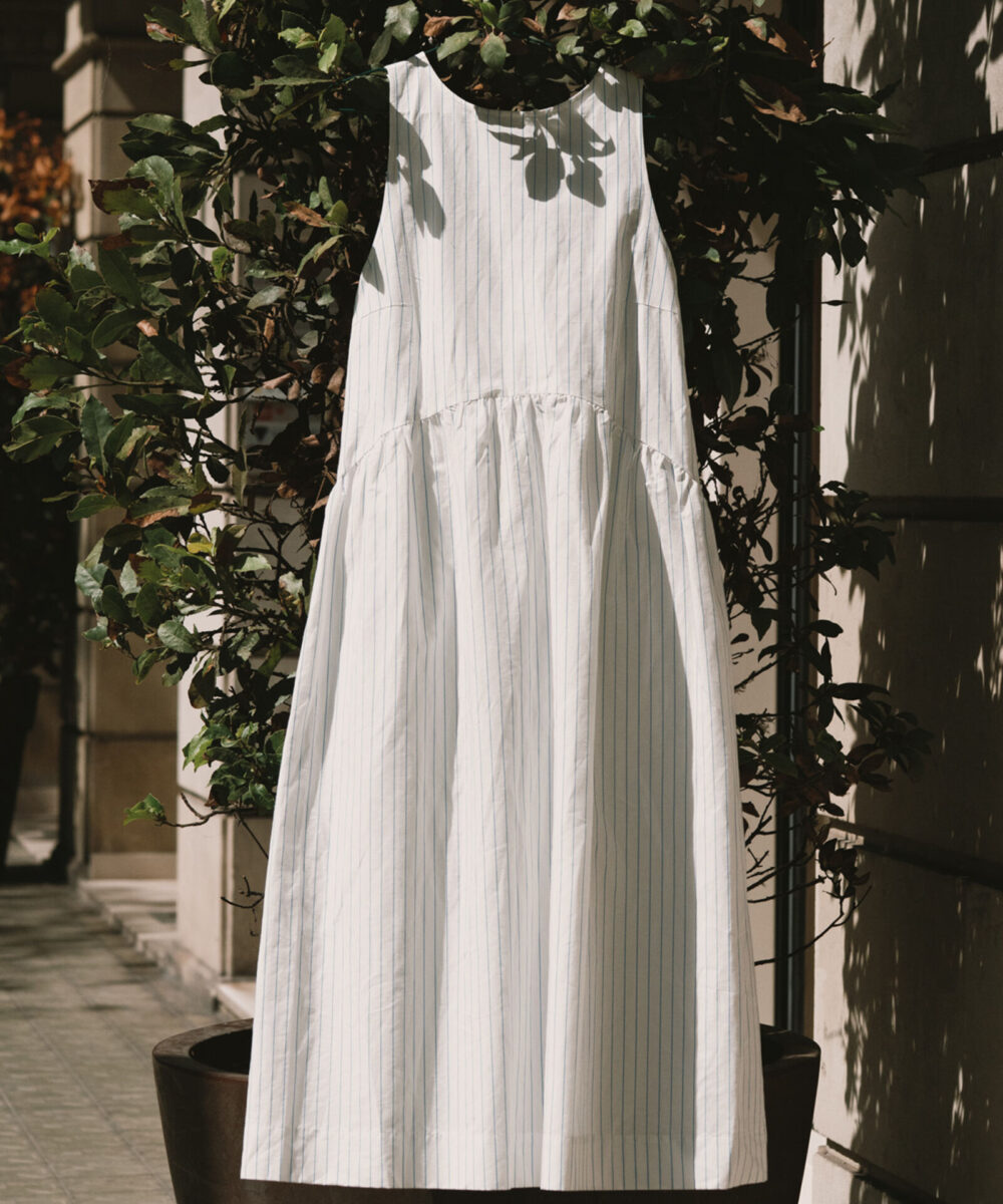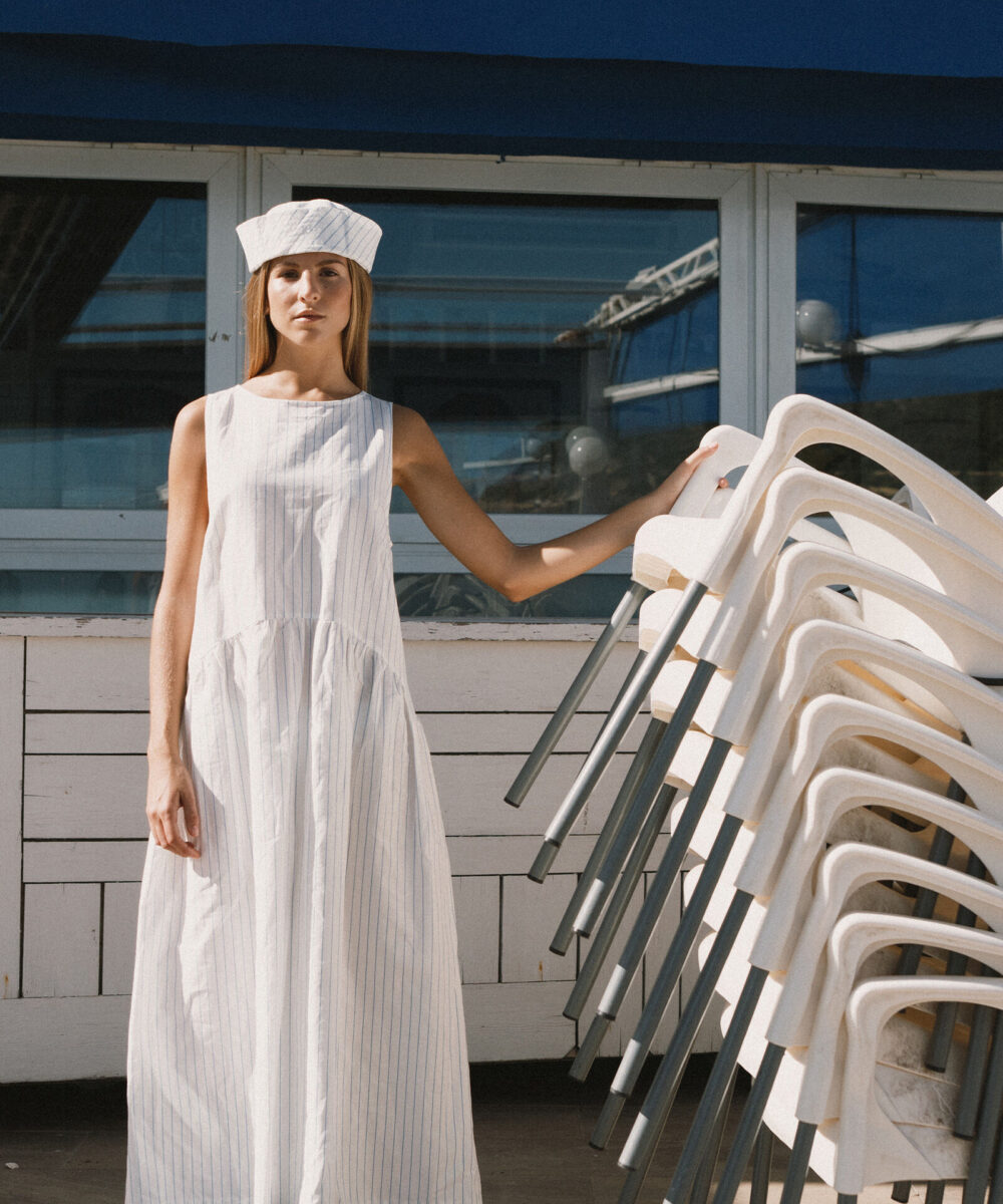 Mouwloze jurk met een lage uitsnede op de rug. De luchtige jurk heeft een streepmotief en loopt wijd uit in een A-lijn. Gemaakt van een crispy katoen & linnen. De ultieme zomerse jurk. Draag er een vest over voor een wat meer geklede look. Deze jurk heeft geen stretch en komt tot enkelhoogte.