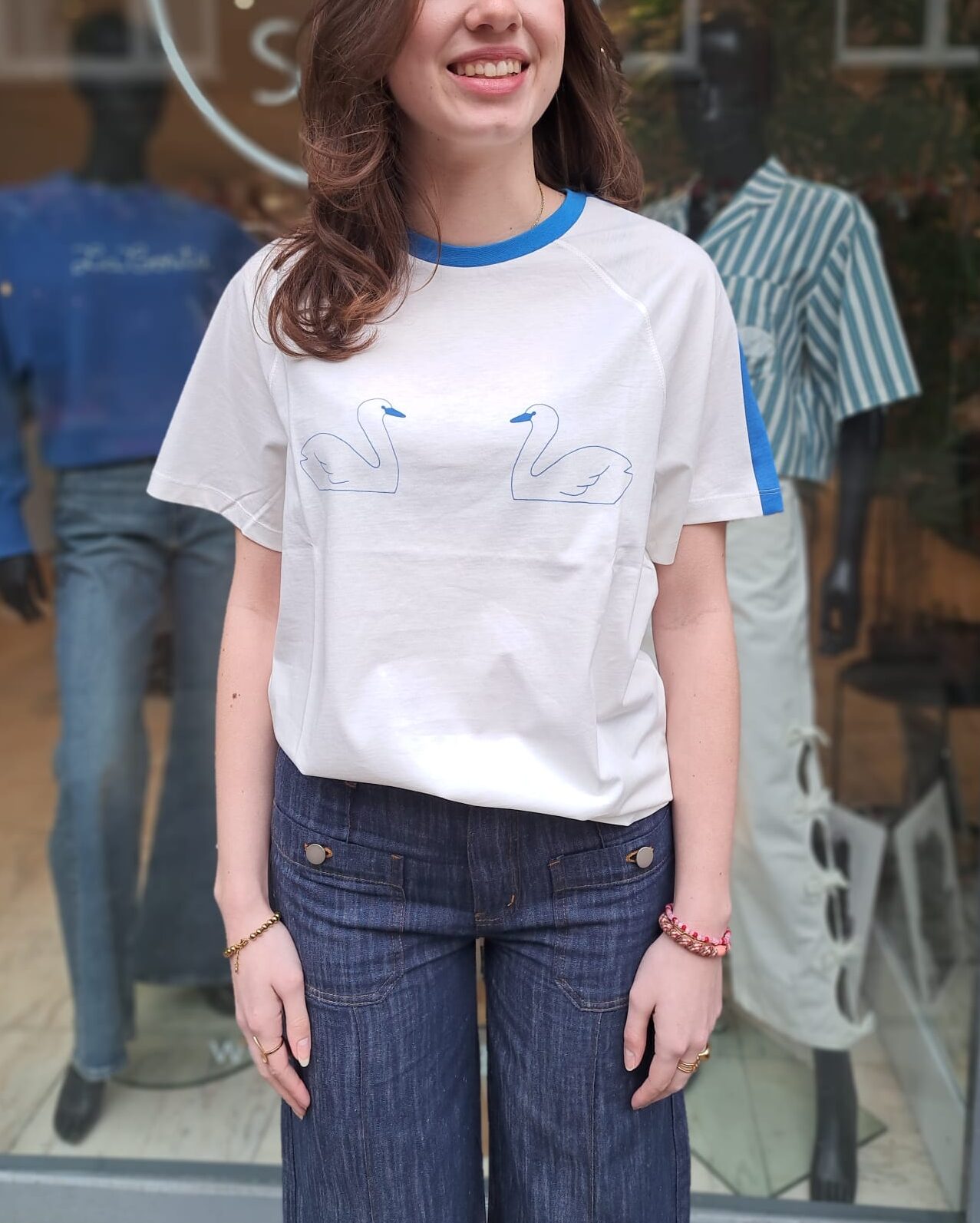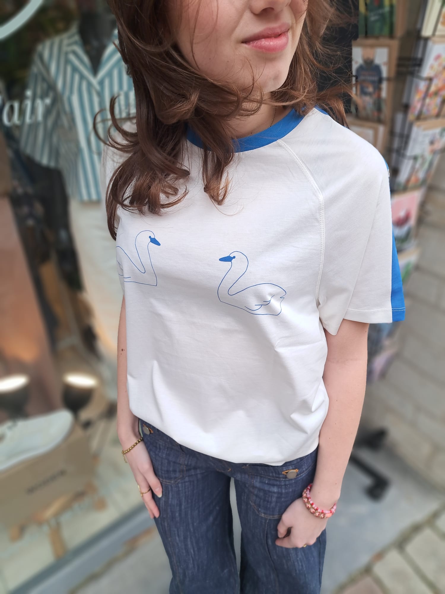 Basic T-shirt met een rechte fit en raglanmouwen voor een vlotte look. Gemaakt van 100% biologisch katoen in de kleur wit met opdruk van twee blauw zwanen en een sportieve streep over de schouders in blauw. Kies je gebruikelijke maat. Anne is 1.73m draagt hier mt S.