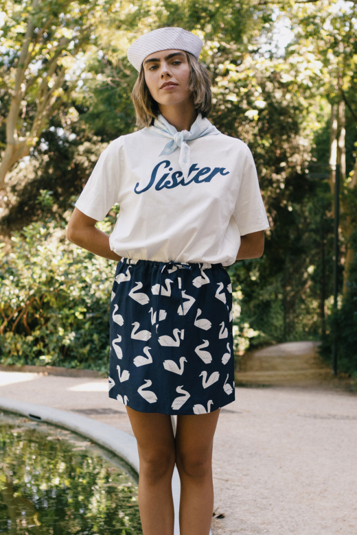 Basic T-shirt met een rechte fit. Gemaakt van 100% biologisch katoen in de kleur wit met opdruk ‘Sister’ in donkerblauw. Kies je gebruikelijke maat. Anne (foto 1) draagt hier mt S.