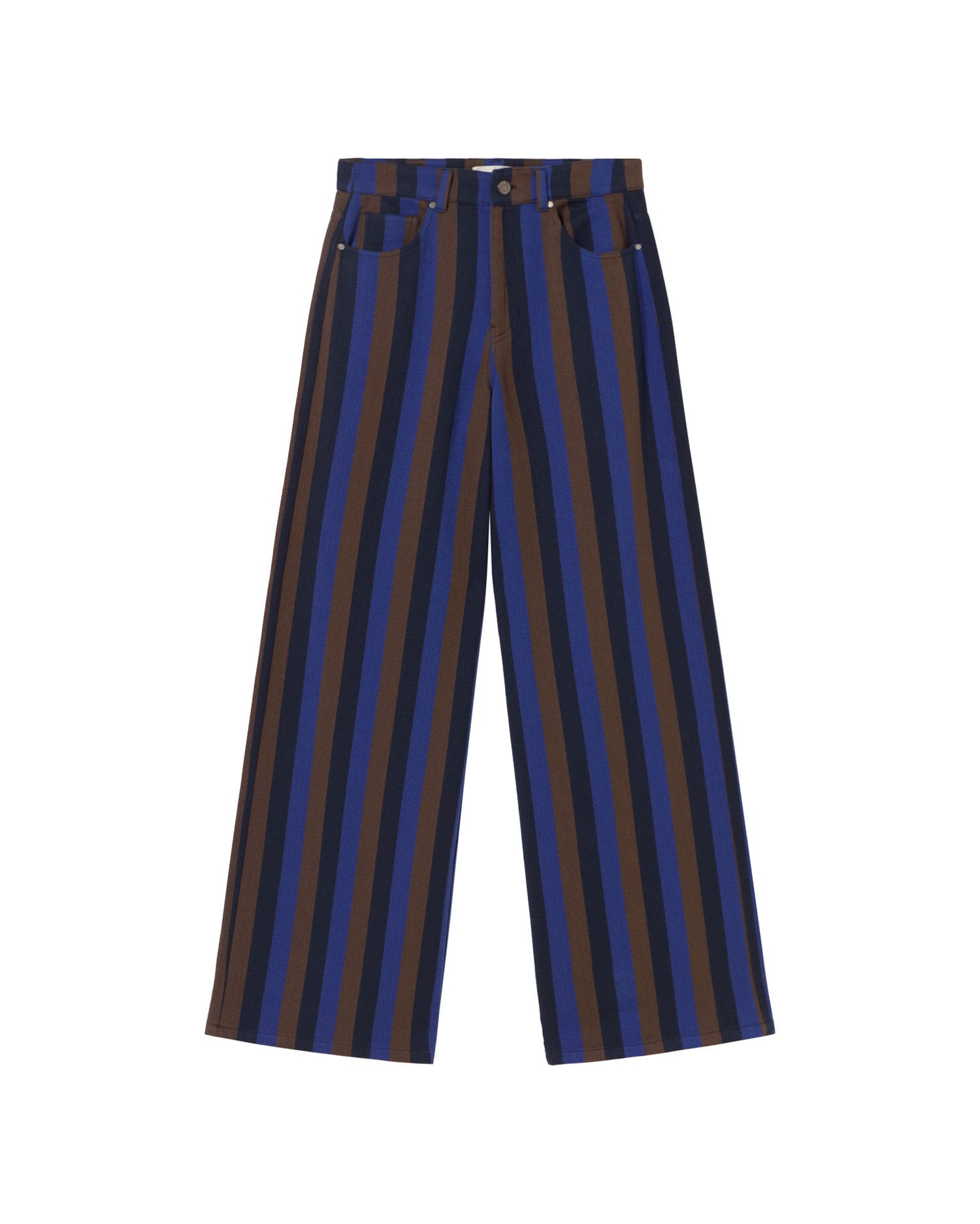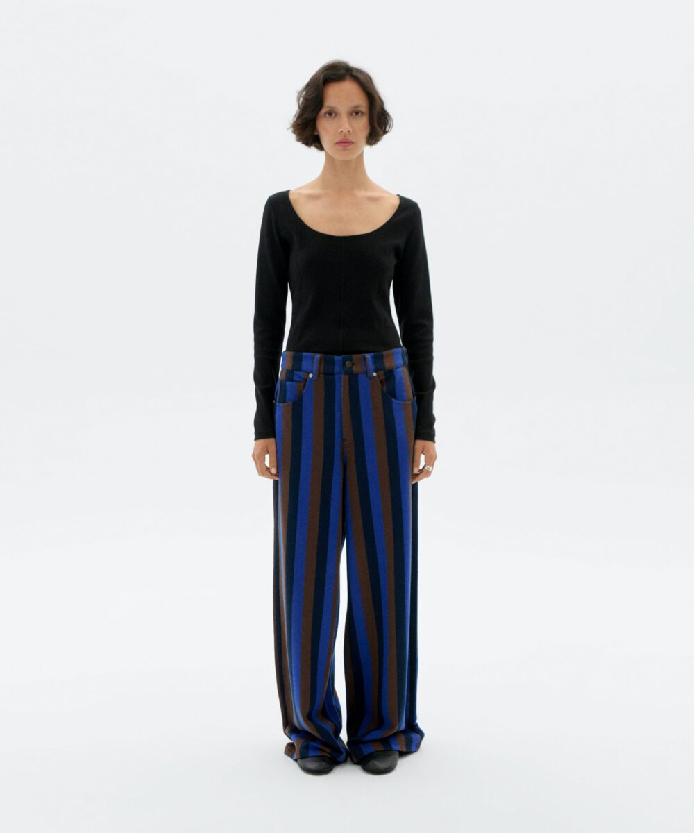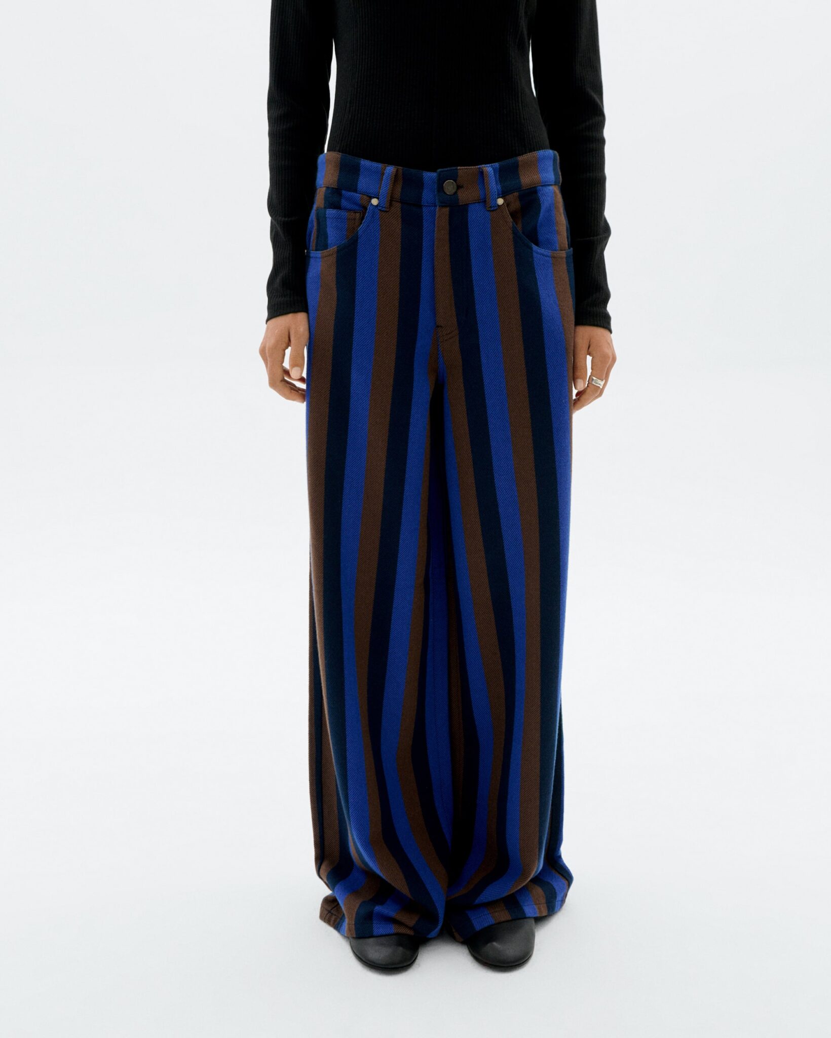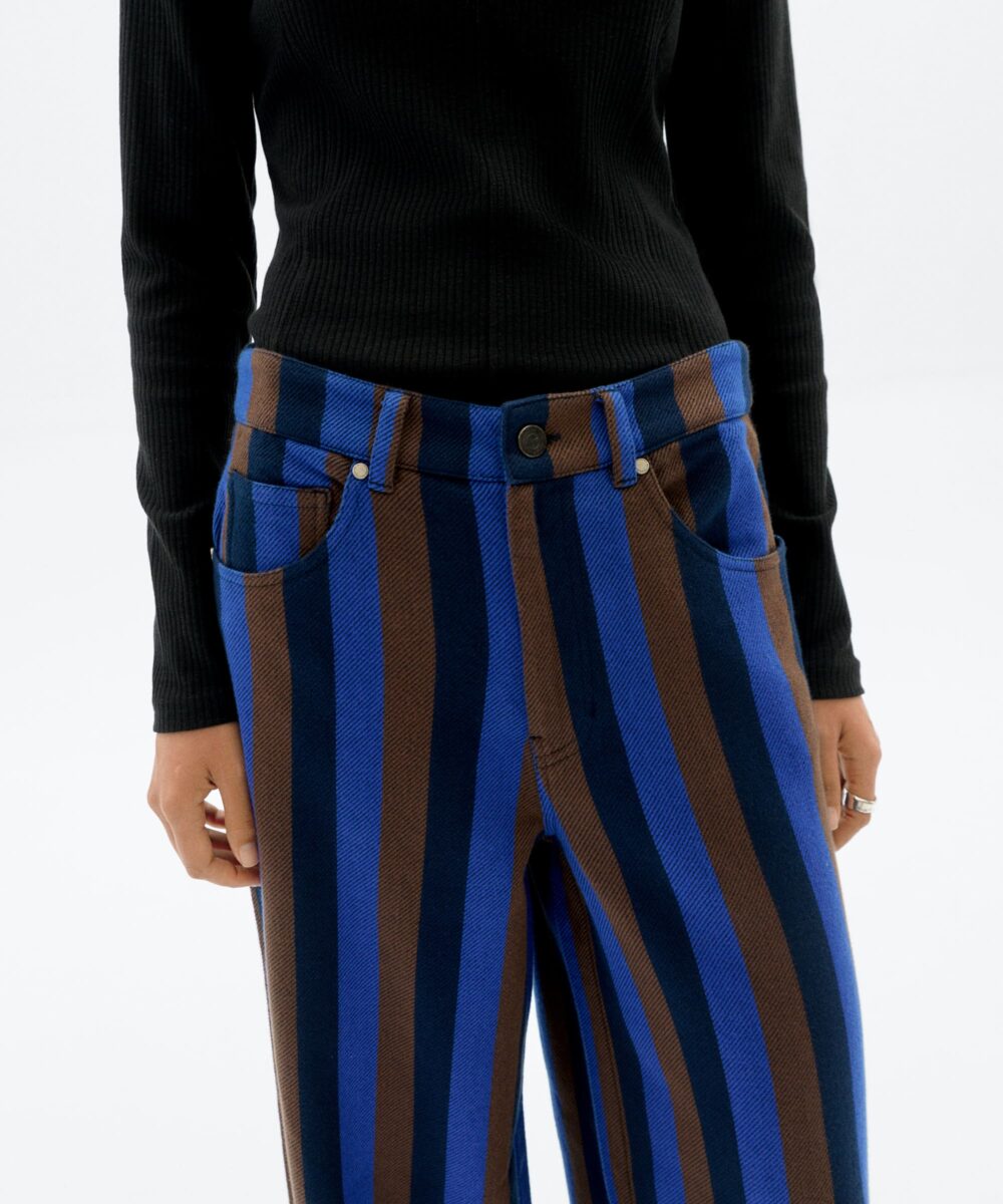 Toffe denimbroek met een streepmotief in de kleuren bruin, zwart & blauw. De broek heeft een zeer wijde broekspijp en kan hoog in de taille gedragen worden, maar kan ook baggy gedragen worden. Maatadvies: Kies voor een aansluitende pasvorm één maat kleiner, dan je gebruikelijke maat.