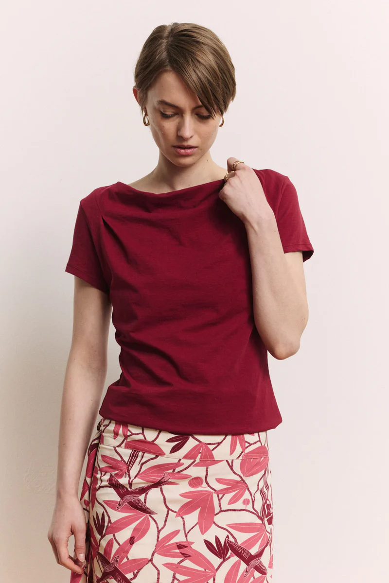 Basisshirt met korte mouwen en waterval-hals in de kleur donkerrood. Fijne basistop die je makkelijk combineert tot een dagelijkse look.